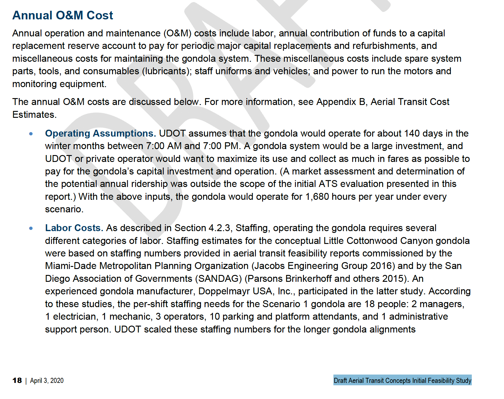 According to the UDOT EIS Annual O&M Cost: A gondola system would be a large investment, and UDOT or private operator would want to maximize its use and collect as much in fares as possible to pay for the gondola's capital investment and operation. The expensive system would also require employing 22 staff per shift.